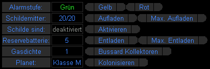 FunktionenNach den Schiffsinformationen folgen noch weitere Informationen, die sich von den vorrausgegangenen Informationen dadurch unterscheiden, dass man sie direkt per Schaltfläche beeinflussen kann. Außerdem werden diese Informationen und Schaltflächen in bester LCARS-Tradition dynamisch ein- und ausgeblendet. Welche Informationen und Schaltflächen dort erscheinen hängt von der Klasse des Schiffes und vom aktuellen Umgebungsstatus ab.